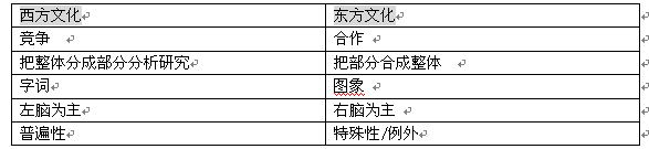 如果你把這個表對折,從鏡子中看上去,左右兩行的位置會互換——東方的就變成了西方的!我想說的是東西方的許多不同都是對應的——我們認為非常重要的原則可能在對方看來并不那么重要。其實這兩行可以銜接起來,例如競爭會促進合作,合作進一步帶來競爭,而競爭再促進合作。