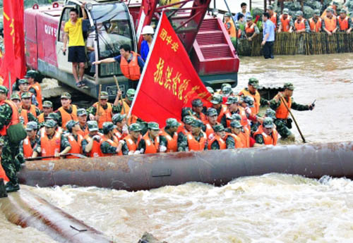 7月18日,南京軍區某部官兵在南京高旺河決堤處封堵決口。