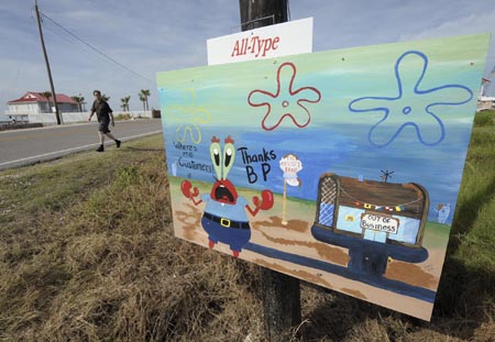 這是7月17日在美國路易斯安那州格蘭德艾爾拍攝的當地居民用熱播電視動畫片主角形象制作的海報。居民們以此表達對漏油事件的不滿。 目前,受墨西哥灣原油泄漏污染最嚴重的路易斯安那州境內海灘正在加緊進行清污工作。英國石油公司15日宣布,新的控油裝置已成功罩住水下漏油點,“再無原油流入墨西哥灣”。