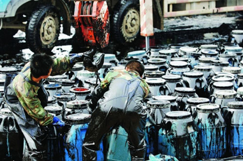 7月25日,工作人員在遼寧省大連市南砣漁港處理收集到的海上溢油。