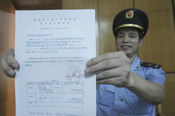 7月20日,在德清縣俞氏塑料制品有限公司,德清縣工商局執法人員展示依據《網絡商品交易及有關服務行為管理暫行辦法》發出的《責令改正通知書》。新華社發 |