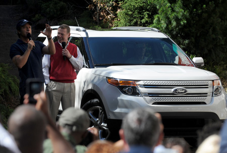 7月26日,美國福特汽車公司總裁兼首席執行官艾倫·穆拉利(上右)出席在紐約曼哈頓舉行的2011款福特Explorer展示活動。當日,福特公司在紐約舉行2011款福特Explorer揭幕展示活動。2011款福特Explorer誕生于福特全新車型平臺,號稱擁有更輕的體重、更高效的發動機以及世界首創的安全技術。