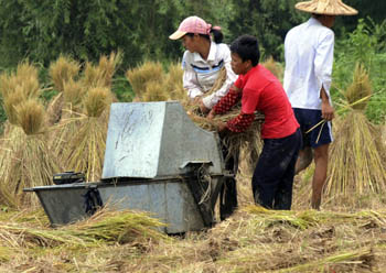 8月7日,柳江縣成團鎮甘塘村農民給早稻脫粒。新華社發(賴柳生