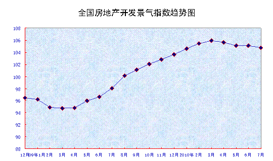7月份,全國房地產開發景氣指數(簡稱“國房景氣指數”)為104.72,比6月份回落0.34點,比去年同期提高6.71點。