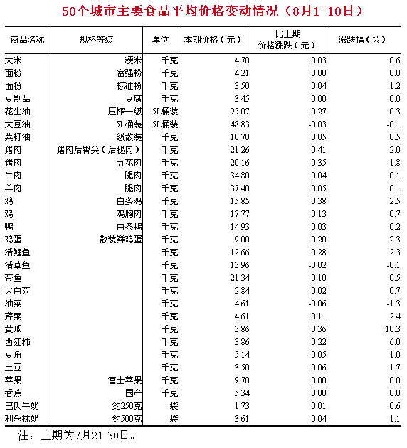 國家統計局16日公布《50個城市主要食品平均價格變動情況(8月1-10日)》顯示,8月上旬,部分蔬菜價格出現明顯上漲。其中,黃瓜價格比7月下旬(下同)增長10.3%,西紅柿價格上漲6%。 數據表明,肉蛋價格穩定回升。散裝鮮雞蛋價格上漲2.3%至每千克9元。豬肉后臀尖(后腿肉)和五花肉價格分別上漲2.0%和1.8%。