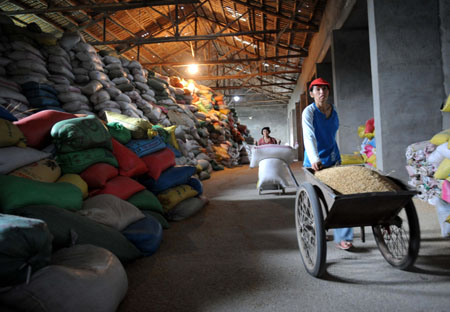 8月19日,江西南昌縣向塘鎮金谷園糧食加工廠員工在倉庫搬運稻谷。 近期,由俄羅斯小麥禁止出口和歐洲干旱引發的國際小麥價格飆升,備受關注,這也給中國糧食市場走向帶來諸多考驗。記者深入我國大米、小麥等主產區采訪發現,面對國際糧價飛漲,國內糧食市場價格平穩,一些品種價格甚至出現下降?傮w而言,我國糧食安全沒有近憂,但有遠慮。