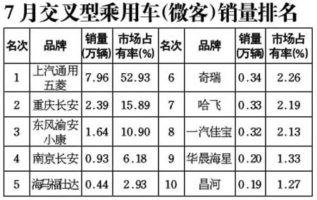 7月份,交叉型乘用車(微客)銷量出現較大幅度下降,銷售15.04萬輛,環比下降21.66%,同比下降3.02%,遠低于成倍增長的SUV市場和MPV市場,成為7月乘用車市場中唯一環比、同比雙降的車型。 從7月份微客的銷售情況來看,四家名次與上月相同,上汽通用五菱、重慶長安、一汽佳寶、華晨海星繼續保持第一、二、八、九位;東風渝安小康與南京長安名次互換;名次上升的有,海馬福仕達由上月的第六升為第五、奇瑞由上月的第十升為第六;名次下降的有,哈飛由上月的第五降為第七,昌河由上月的第七降為第十。 7月微客銷量前十名中,僅有奇瑞環比上升21.43%,成為唯一的亮點,其余均下降,其中哈飛、南京長安和昌河降幅最大,分別為58.75%、51.56%和51.28%。五菱系列7月繼續回調,其銷量已達今年以來最低位。6月環比上升的重慶長安與東風渝安小康也出現回調,降幅分別為37.92%和6.81%,此外華晨海星也大跌了33.33%。 7月交叉型乘用車淡季效應明顯,環比降幅處于正常區間。目前,微型客車可以享受重啟的汽車以舊換新、汽車下鄉、購置稅三項補貼,但7月環比出現如此大的跌幅,反映出政策對微型客車的拉動效應正在逐漸減弱。如果這一趨勢延續,則8月微客市場將出現比7月更低的銷量。預計到今年年底,三項補貼政策將到期,屆時才會掀起一輪搶購潮。