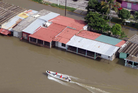 9月4日,在墨西哥韋拉克魯斯,救援人員乘沖鋒舟對洪災地區實施救援。 當日,韋拉克魯斯州幾個受災嚴重城市的2萬多名居民被疏散至安全地區。墨西哥東南部地區近來持續暴雨,河流水位不斷上漲引發洪水,造成28萬人受災,另有7人死亡。