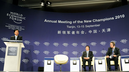 9月15日,在天津梅江會展中心,大連市委書記夏德仁(左一)在閉幕全會上講話。當日,世界經濟論壇2010年新領軍者年會(第四屆達沃斯論壇)舉行閉幕全會。