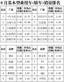 8月,銷量排名前十位的轎車品牌共銷售17.21萬輛,占轎車銷售總量的24.16%。與上月比較, 前十位轎車品牌銷量八增二降,新寶來增長最快,為22.422%;悅動與凱越分別增長16.34%、13.41%;F3和卡羅拉分別微降0.68%、2.92%。