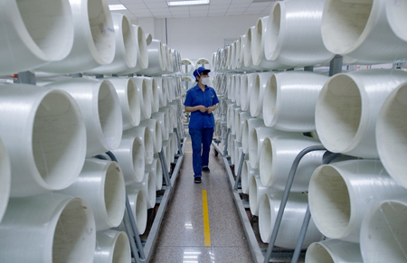 圖為一名工作人員從玻纖半成品車間走過。(新華社發)