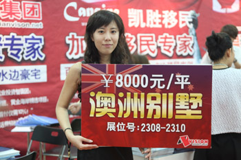 在日前舉辦的北京秋季房地產展示交易會上,一名禮儀小姐手拿別墅廣告牌吸引參觀的購房者。新華社發(劉爽 攝) |