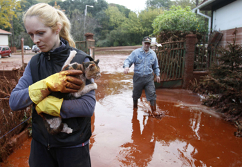 10月5日,在匈牙利首都布達佩斯以西150公里的一個村莊,當地居民抱著一只貓離開被有毒廢水覆蓋的地面。新華社/路透 |