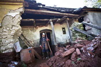 一位年老的村民正在災后清理被泄漏廢水沖刷后的房屋和花園。法新社發 |