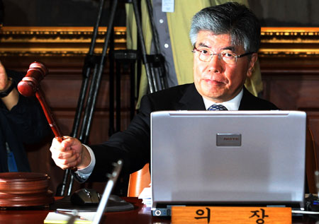 10月14日,在位于韓國首爾的韓國央行——韓國銀行內,韓國央行行長金仲秀在主持例會。 當日,韓國中央銀行——韓國銀行召開金融貨幣委員會例會,宣布將基準利率保持在目前的2.25%水平不變。這是韓國央行連續三個月維持基準利率不變。有分析人士指出,韓國央行行長金仲秀在8月凍結利率后曾多次強調要穩定物價并恢復利率正;,因此,央行做出維持基準利率的決定可能會錯失加息良機。