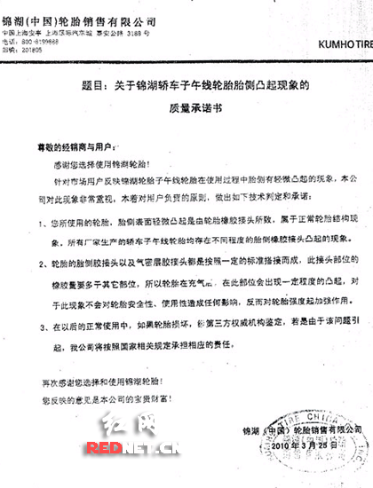 | 廠家錦湖輪胎公司在《質量承諾書》中稱,輪胎輕微凸起屬正,F象 |
