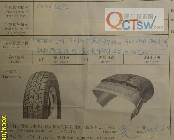 這一次在錦湖南寧輪胎經銷店,鑒定人員草草觀察了一下輪胎表面,就得出了結論:簾線斷裂是由于使用不當就成,接頭位置鼓包屬正,F象,不影響使用!隨后拿出一張打印好的鑒定報告,在“非輪胎品質問題”上面打勾,算是鑒定完畢。令人啼笑皆非的是,鑒定人員甚至連輪胎規格都沒看清楚,將185的輪胎填成了195/165/R15,整個鑒定過程十分兒戲。(投訴詳見:悅動錦湖輪胎未到5000公里輪胎鼓包) 除鼓包外,側裂也是車主們經常反映的輪胎問題之一。如安陽市的劉先生就向汽車投訴網發帖稱,他的北京現代悅動右前輪錦湖輪胎側壁有一條長約1.5cm的裂縫,而此時他的車僅僅行駛了一年多,他希望4S店能對該輪胎進行妥善處理。