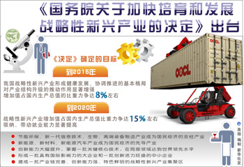 10月18日,《國務院關于加快培育和發展戰略性新興產業的決定》指出,根據戰略性新興產業的特征,立足我國國情和科技、產業基礎,現階段將重點培育和發展節能環保、新一代信息技術、生物、高端裝備制造、新能源、新材料、新能源汽車等產業。到2015年,七大戰略性新興產業的增加值占中國GDP的比重將提高到8%,到2020年將升至15%。