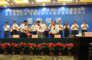 吉林省副省長王祖繼代表省政府與首鋼總公司董事長朱繼民、首鋼控股公司總裁李志強共同簽訂了《戰略合作框架協議》。首鋼總公司、首鋼控股公司、吉林省國資委、吉林省建通投資公司、通鋼集團負責人共同簽署了《通鋼集團重組協議》。通化市政府與首鋼控股公司簽訂了《戰略合作框架協議》。