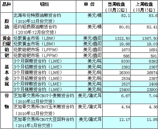 當周國際大宗商品價格全線回落,周中受中國意外加息影響,市場擔心需求減少,各品種期貨價格暴跌,截至周末跌幅收窄。不過,由于大多數投資者預期美聯儲將采取定量寬松的政策刺激美國經濟復蘇,大宗價格仍將在一段時間獲得支撐。