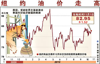 由于中國和美國經濟數據利好等因素的影響,國際油價1日全面走高。紐約商品交易所12月交貨的輕質原油期貨價格比前一個交易日上漲1.52美元,收于每桶82.95美元;倫敦市場北海布倫特原油期貨價格上漲1.47美元,收于每桶84.62美元。