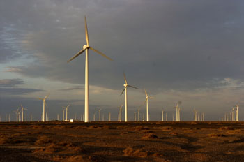 攝 | 如果說誰是我國新能源產業發展的代表,無疑要屬于甘肅省。因為從2008年開始,國家先后在這個省的河西走廊布局了我國新能源的“兩個第一”:第一個千萬千瓦級風電基地,第一個10兆瓦光伏并網發電特許權項目。這兩個項目都建設在酒泉市。記者7月中旬深入這“兩個第一”所在地采訪,目睹和感受了我國新能源快速發展的激情。 沿國家高速G30線西出嘉峪關百余公里,就開始進入我國第一個千萬千瓦級風電基地——酒泉風電基地。成片的風車沿公路兩旁排列,獵獵朔風中,歡快地旋轉。高速公路上,運送風電設備的大型運輸車輛川流不息,四、五十米長的風葉,七、八十米高的塔筒,都要從位于肅州區的風電設備產業園運到玉門和瓜州境內的20個風電場。 記者在玉門市、瓜州縣風電建設現場看到,拉運風機和葉片的車輛穿梭不息,長達200多公里風電場建設工地上,吊機林立,機聲轟鳴,一派繁忙的建設景象。為保工期,搶進度,上萬名建設者晝夜施工。 作為一種新能源,風電產業近兩年在我國高速發展,無論從風電投資規模、裝機容量,還是其帶動的風電設備制造業,以及電網建設的層次來看,風電已經成為我國新能源領域中最熱點的產業。而這個“熱度”從酒泉風電基地就能體現出來。 “酒泉風電平均每天裝機0.6萬千瓦,特別是進入5月下旬的施工旺季以來,酒泉每天就有4萬千瓦的風電場落成,相當于一個星期就建成一個30萬千瓦的火電廠,而一個30萬千瓦的火電機組的建設工期最短都需一年半的時間!本迫邪l改委副主任吳生學說。 酒泉境內的瓜州縣、玉門市和肅北馬鬃山地區一帶因獨特的喇叭口地形,在季風的作用下,形成了豐富的風能資源,被稱為“世界風庫”。因而這一區域成為我國風能資源最豐富的地區之一:風能密度高,10米高度平均風能密度達397瓦/平方米,40米高度平均風能密度達639瓦/平方米;風向比較穩定;風電機組年有效利用小時數在2300小時以上;酒泉市可開發風能在4000萬千瓦以上。 2009年4月,國家發改委批準了酒泉千萬千瓦級風電基地建設規劃。當年8月8日,國家發改委和甘肅省在玉門市昌馬風電場舉行了一期工程開工建設儀式。 甘肅酒泉千萬千瓦級風電基地是迄今為止我國和世界上規模最大的風電工程。記者從當地政府部門了解到,基地的建設可以用日新月異來形容。去年底,酒泉風電基地裝機突破200萬千瓦,今年進入5月份施工旺季以來,酒泉風電基地步伐加快,每天就有4萬千瓦的風電場落成,幾乎每月能實現裝機近100萬千瓦。繼5月31日裝機突破300萬千瓦大關、達到308萬千瓦后,7月15日又突破了400萬千瓦,達到了403.6萬千瓦,占今年年內累計裝機計劃516萬千瓦的78%。而按照國家規劃,今年底將實現516萬千瓦。據酒泉市發改委副主任吳生學介紹,在這403.6萬千瓦中,玉門市實現裝機147.8萬千瓦,瓜州縣實現裝機255.8萬千瓦。 目前,在河西走廊西端,已經有3000余臺風機聳立在戈壁沙漠里,西出嘉峪關,既可看著綿延200余公里的“白色森林”。 據了解,酒泉千萬千瓦級風電基地包括20個風電場。目前,這20個風電場已經全部開始建設,其中風電基地的首座風電場——中節能港建公司投資建設的玉門市昌馬第三風電場區40萬千瓦風電場已經于6月9日全部建成。中節能港建公司管理部經理苗青強接受記者采訪時說,這座風電場正式竣工后,預計年上網電量可達8.58億千瓦時,每年可節約標準煤30萬噸,減少二氧化碳排放量81萬噸。