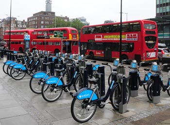 10月2日,在英國首都倫敦,絡繹不絕的公交車駛過一個自行車租賃站。 |