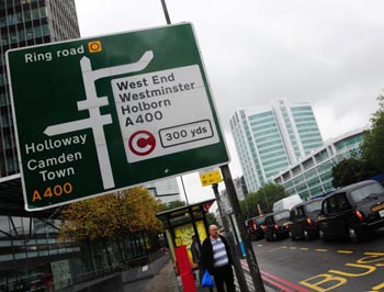 倫敦中心區劃有一個巨大橢圓形區域為擁堵區,周一至周五從上午7時到晚上6時進入該區域需繳納擁堵費。從距離該區域的幾英里遠的地方就不斷出現醒目的大紅色“C”字提示標志,告訴你距離收費區還有多遠,不需進入收費區的車輛可以及早改道。接近收費區時顯示有醒目的紅色“C”字標志頻繁出現,不必進入該區域的車輛仍有機會改道行駛。越過地面標有紅色“C”字標志即進入擁堵區,你的車輛將被自動拍下車輛牌號,你必須盡快繳納“擁堵費”。當天繳納費用為每輛車每天8英鎊,交費一次當天即可多次出入。如果第二天繳納即需付10英鎊。因此,對許多倫敦居民來說,在開車時必須注意前方是否有標注字母C的收費區,一旦越過界線,便須交納“交通擁堵費”。