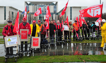 圖為德國工會組織IG-Metall的成員17日在柏林總理府前舉行示威活動,抗議政府的財政緊縮措施。作為財政緊縮政策的一部分,德國勞工部長馮德萊恩當天宣布,將退休年齡從65歲提高至67歲。由于出生率下降、人口老化,加上金融危機暴露歐洲各國的財政赤字問題,歐洲各國在出臺財政緊縮措施時都將削減退休金成本作為重要內容,推遲退休已成趨勢。此前,法國政府的退休制度改革也引發了曠日持久的罷工潮。