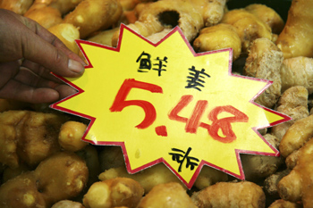 山東省臨沂市郯城縣一家超市的員工將當日的價格牌放在生姜上。 據新華社全國農副產品和農資價格行情系統監測數據顯示,11月9日以來,全國生姜價格降勢明顯,截至11月22日累計降幅為2.8%。新華社發(張春雷