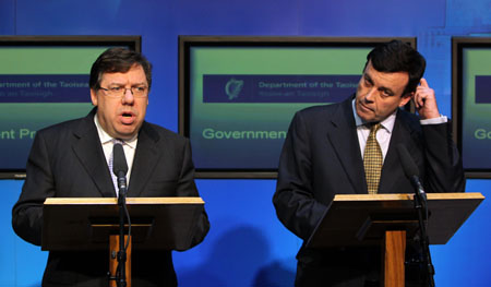 11月21日,愛爾蘭總理布賴恩·考恩(左)和財政部長布賴恩·勒尼漢在首都都柏林出席記者招待會?级鳟斖碚f,愛爾蘭向歐洲聯盟(歐盟)和國際貨幣基金組織(IMF)提出的一攬子金融援助請求已經獲得歐盟的批準(相關報道見四版)