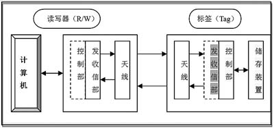 RFID系統一般由電子標簽(Tag)、讀寫器(Reader)和信息處理系統三部分組成。電子標簽主要是由IC芯片和天線(Antenna)構成。讀寫器由環形天線、控制模塊和收發裝置組成。分為手持和固定兩種,收發裝置和計算機或編程邏輯控制器(PLC)連接從而實現相互信息交換(RFID系統結構參照圖3)。