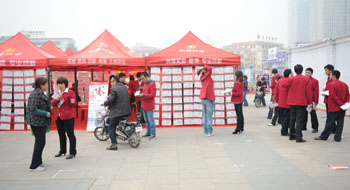 日前開幕的“2010河北省住宅產業現代化博覽會”上,不僅房地產開發商布展缺少了往日的奢華,前來咨詢看房的市民也不多。圖為一家房地產中介公司展位,工作人員聚在一起聊天,前來咨詢者寥寥。新華社記者