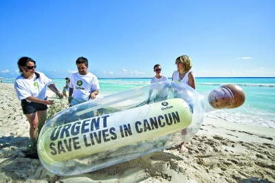 坎昆聯合國氣候變化大會29日將在墨西哥海濱城市坎昆召開,來自190多個國家和地區的官員、學者及非政府組織成員將就氣候變化問題展開磋商。分析認為,雖然各方普遍認為坎昆會議難以達成具有法律約束力的協議,但此次會議在資金技術、森林保護等方面仍有達成共識的空間,可為明年南非氣候大會打下基礎。圖為環保人士在坎昆海灘開展活動。(相關報道見四版)