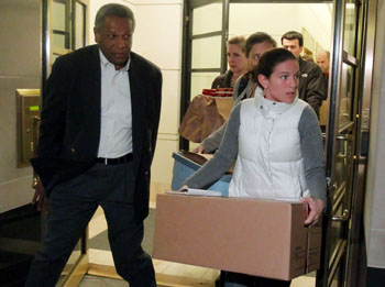 11月22日,FBI的工作人員突襲檢查了美國三家對沖基金的辦公室,并帶走了成箱的文件。這三家公司被認為與一樁內幕交易案件有關。圖為執法人員搬走印有“證據”字樣的箱子。(路透社) |