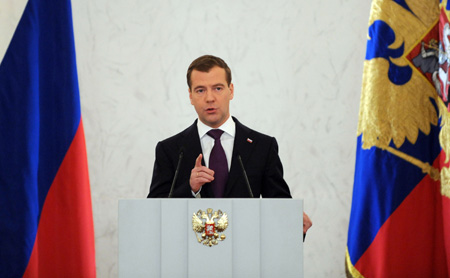 俄羅斯總統德米特里·梅德韋杰夫11月30日向俄聯邦議會兩院發表國情咨文時表示,預計全年GDP增長將達到約4%。未來三年,政府將把年通脹率控制在4%至5%的水平。他還表示,金融危機的影響并未完全消除,俄政府仍將無條件履行自身的社會責任。
