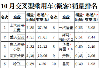 10月份,交叉型乘用車(微客)銷售20.87萬輛,環比增長6.87%,同比增長19.17%,成為乘用車中惟一環比同比雙增長的車型,這已是微客連續兩月保持此殊榮。