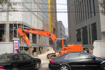 在合肥市重點工程——金鷹國際購物中心項目工地,一臺挖掘機停放在工地入口處。據一名工人介紹,11月2日晚,該工地突然出現了多名不明身份人員,隨后3輛大型挖掘機停放在工地,封堵了該工地出入口及施工現場,造成該工地正常施工中斷。截至12月2日,仍有一臺挖掘機停放在工地現場。