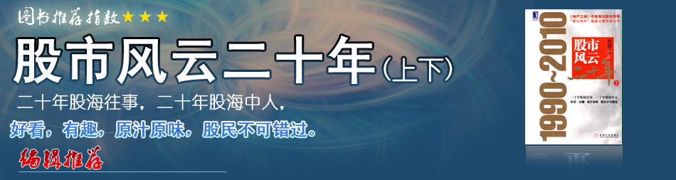 | 《股市風云二十年(1990-2010)》重新回顧了股市走過的路,路上或精彩或慘淡的人生,頂點輝煌與谷底彷徨的劇烈反差;厥20年,才發現燈火闌珊處,A股還是那個熟悉的身影,而世界早已桑田變滄海了…[詳細] |