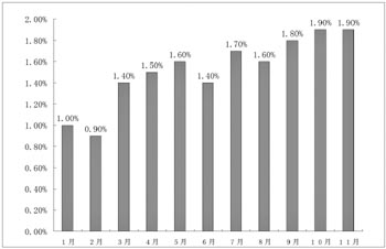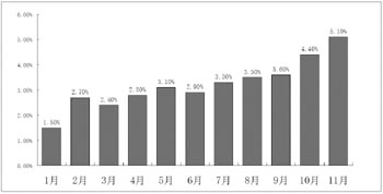 4月份我國CPI同比上漲2.8%,漲幅創出自2008年11月份以來的18個月新高;5月份CPI同比上漲3.1%,年內首次突破3%的溫和警戒線;7月份CPI同比上漲3.3%,隨后8月份同比上漲3.5%,9月份上漲3.6%,10月份4.4%,11月份5.1%,漲幅連續5個月逐次創出今年新高。從1月份的CPI同比上漲1.5%,到11月份的上漲5.1%,物價問題可以說是今年經濟各界最關心的問題之一。