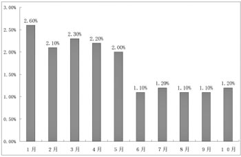 其次,消費品價格有可能繼續上升。今年1至9月我國居民消費價格上漲了2.9%,已經逼近3%的預期目標。由于受自然災害、成本上升和國際糧價上漲等因素的影響,食品的價格上升較快。其中,糧食上漲10.9%,肉禽及制品上漲0.9%,蛋上漲5.8%,水產品上漲7%,鮮菜上漲20.2%,鮮果上漲12.2%。今后幾個月,受國際糧價推高和種糧成本上升等因素影響,這些產品的價格還可能保持在高位。