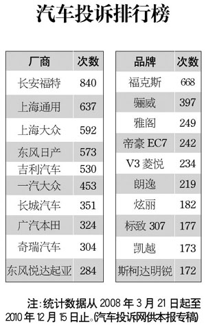 汽車投訴排行榜[2010-12-16]