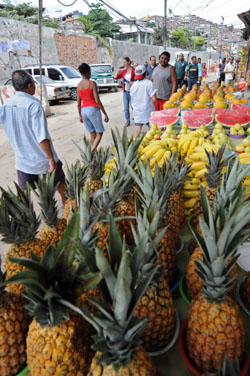 今年以來,巴西消費者價格指數已經累計增長4.38%,接近巴西政府為今年設定的上限4.5%。圖為路人經過巴西里約熱內盧的一個水果攤。(新華/法新) |