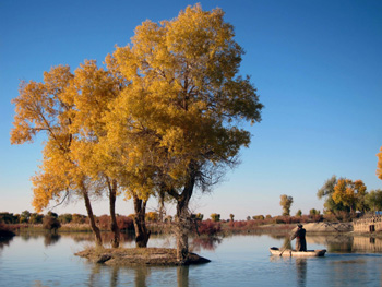 塔里木河的不羈造就了她獨特的生態系統,在蒼茫沙海中形成了神奇的沙漠森林和沙漠草原景觀,僅塔里木河流域的胡楊樹就占中國胡楊總面積的70%以上。每年10月中旬以后,被胡楊樹遮掩的塔里木河流域呈一片金黃,若從空中俯瞰,大地猶如鋪蓋上金色的地毯,眾多的河汊湖泊鑲嵌其上形如寶石,景色獨一無二,壯美之極。不論是沙丘上還是河道旁,胡楊樹皆展現玲瓏剔透的金燦,也透露出另一種不羈和滄桑的美,此時的塔里木是我國西部最好的觀賞、度假、攝影的去處之一。