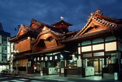 道后溫泉擁有3000年左右的悠久歷史,是日本最古老的溫泉。溫泉浴池的主樓是道后溫泉的象征,建于1894年,是三層木制結構的建筑。據說動畫電影《千與千尋》中的浴池就是以它為原型創作出來的。 雄偉的三層木結構城堡式建筑,是第一個被指定為重要文物的公共浴場,在現代化的旅館和商店中間,更加顯示出它悠久的歷史和不同的風格。屋頂有被稱為振鷺閣的望樓,望樓上的“刻太鼓”在每天早中晚擊打三次,悠遠的鼓聲在溫泉之鄉久久回蕩。在道后溫泉本館,只洗澡不投宿也可以在大開間或單間的休息室里休息。