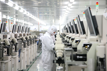 北京開發區星網工業園匯聚了全球20多家頂級通信企業,形成了全球獨一無二的零庫存“星網模式”。圖為開發區威訊公司生產線。 |