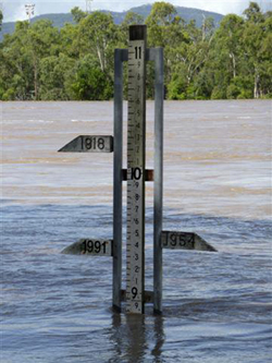 澳大利亞東部遭受罕見洪災。這是1月2日在澳大利亞昆士蘭州羅克漢普頓拍攝的菲茨羅伊河中測量洪水水位的標尺。新華社/美聯 |