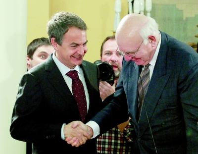 西班牙首相薩帕特羅11日在首都馬德里對商界領袖發表演講,他指出,2011年至2015年,西班牙的經濟增速將在2%到2.5%之間。當天,同為“歐豬五國”成員的葡萄牙央行發表經濟報告稱,預期2011年葡萄牙經濟將收縮1.3%,遠低于此前做出的2011年經濟零增 長的預期。分析人士認為,歐債危機將再起波瀾。 圖為薩帕特羅在當天的演講結束后會見經濟學家保羅·沃克的情景。