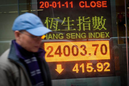 1月20日,市民從香港灣仔一家銀行的恒生指數電子顯示屏前走過。 當日,香港恒生指數以24003.70點收市,跌415.92點,跌幅為1.70%。 有分析人士指出,內地20日公布經濟數據,去年全年GDP升10.3%高于市場預期,投資者憂慮內地收緊銀根。預期港股短期要消化內地可能再加息的影響,但長遠仍看好后市表現。