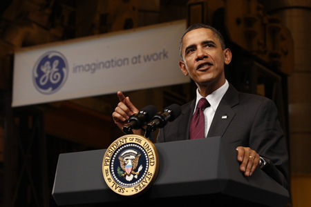美國總統奧巴馬當地時間22日在每周例行電臺演說中釋放出“支持經濟增長、支持貿易”的信息。有消息稱,奧巴馬在當地時間25日發表的國情咨文,將以“制造就業機會,提高美國競爭力,增加基礎設施、教育和研究開支,削減國債”為主軸。 圖為奧巴馬當地時間21日走訪通用電氣公司總部時發表演講。